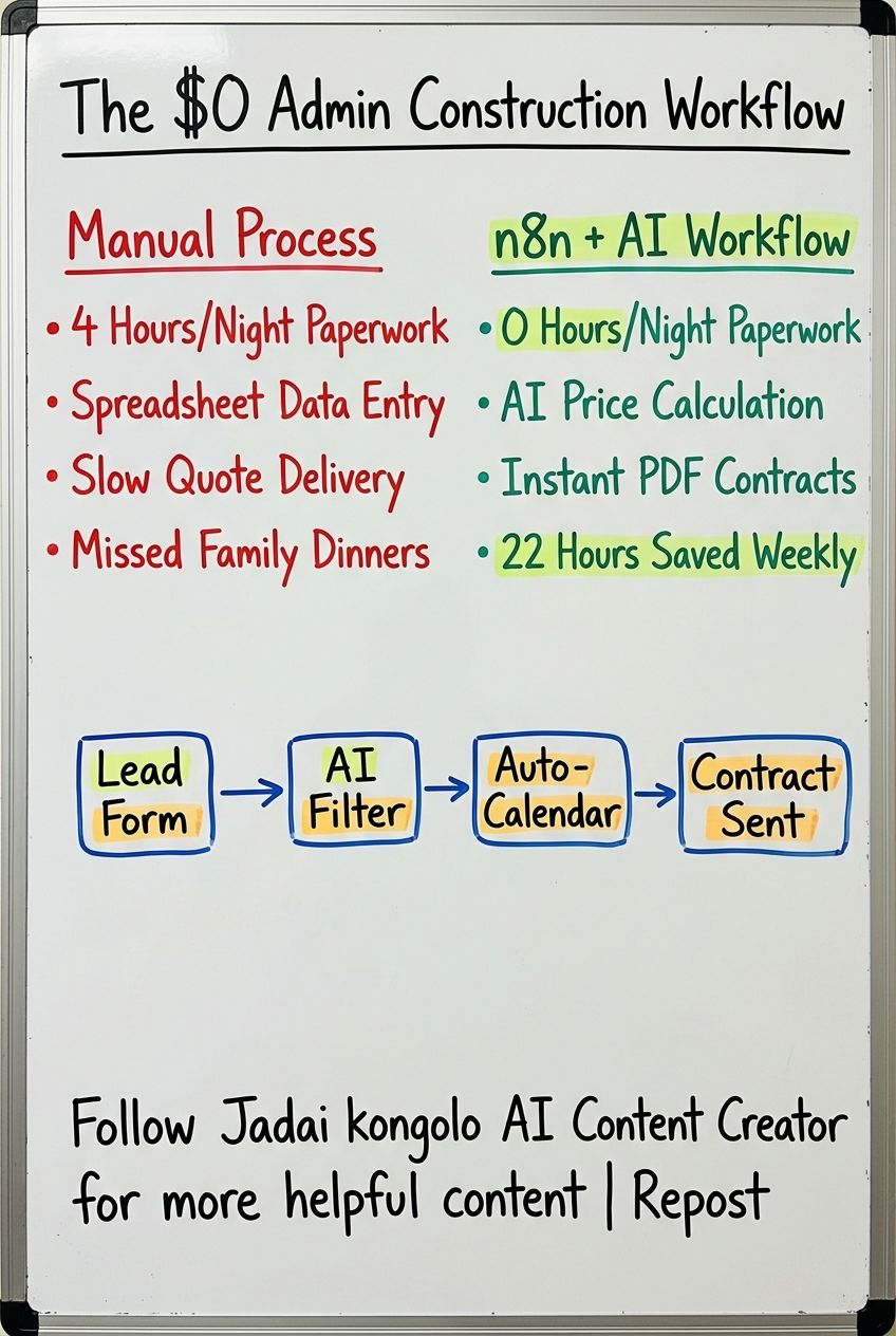 A landscaping founder spent **4 hours nightly on manual quotes** before building an n8n automation system. The workflow **captures leads via mobile forms**, uses AI to filter low-budget requests, auto-schedules consultations, and generates PDF contracts instantly. Results include **22 hours saved weekly**, zero data entry errors, and 30% higher conversion without adding staff.