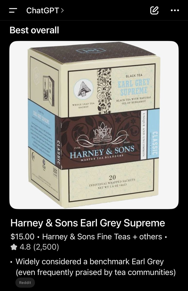 Shopify's **ChatGPT integration now pulls live product data** including variants, ratings, and pricing directly into AI responses. A search for 'best Earl Grey' **returned a Shopify store as #1** with complete product details automatically populated from structured data. Stores with **clean product titles and proper structured data** are now discoverable through conversational AI search without extra effort.